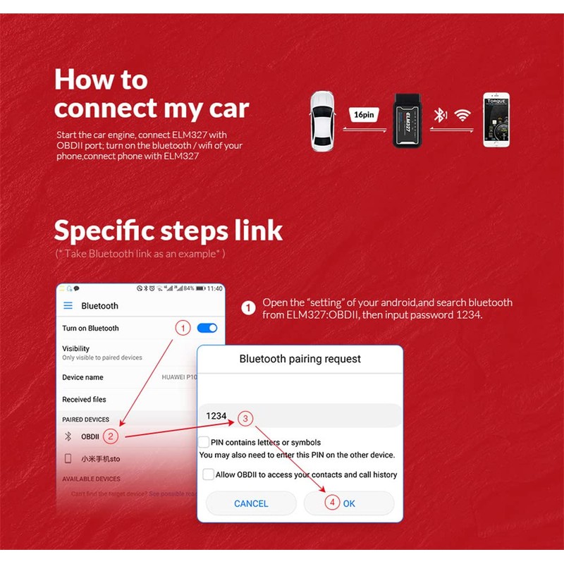 - Proporcionamos 3 meses de calidad, y te daremos un reembolso o te enviaremos un reemplazo si no estás satisfecho con nuestro producto. El dispositivo funciona en coches de gasolina OBD2 y coches EOBD. Conexión Bluetooth, sin baterías, cables o interruptores. - Inalámbrico (Bluetooth) 5 ~ 10 metros.
