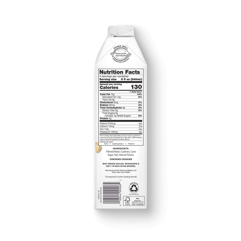 - CASHEW MILK: Treat yourself to a Milked Cashews sort of day: a pleasure in your morning coffee, an enriching glass in the afternoon, and a sauce recipe by evening. A delicious source of fiber & iron.