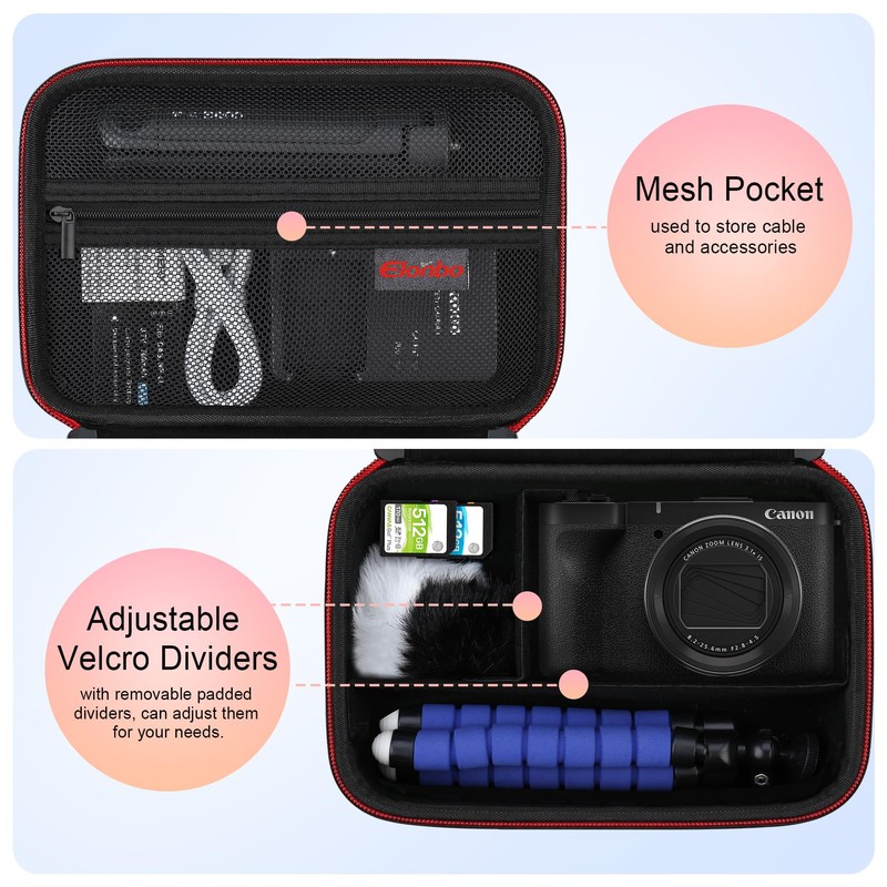 • 【Unique Velcro Dividers Design】--This canon powershot v1 digital camera travel storage bag, main compartment comes with 2 pcs removable magic tape, you can adjust them for your needs to take full advantage of each space, to help you organize your canon powershot v1 digital camera and accessories kit tripod, usb sd card reader, ac adapter, battery, cable.