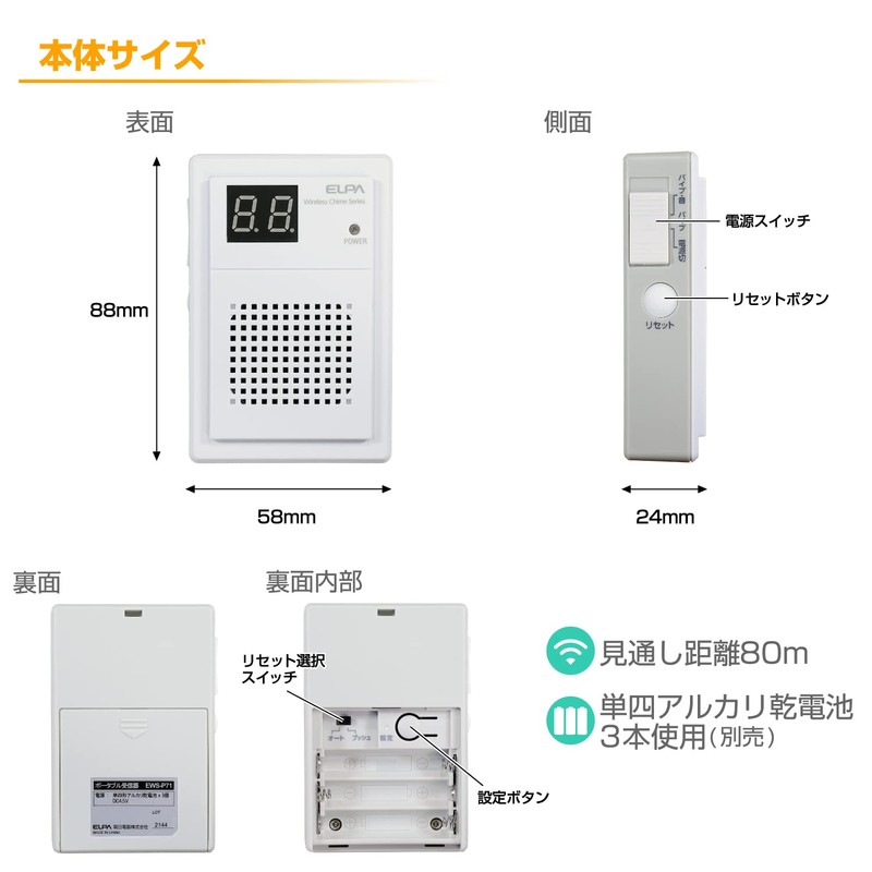 ELPA EWS-P71 Wireless Chime Portable Receiver, Intercom, No Construction Required, Nursing, Wireless, No Wiring Required