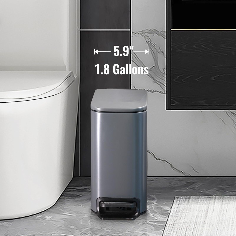 - Compact Design: With a 1.8 gallon capacity, this bin fits perfectly into tight spaces, making it ideal for narrow bathrooms, bedrooms or offices. Its compact shape allows it to fit in tight corners or small spaces