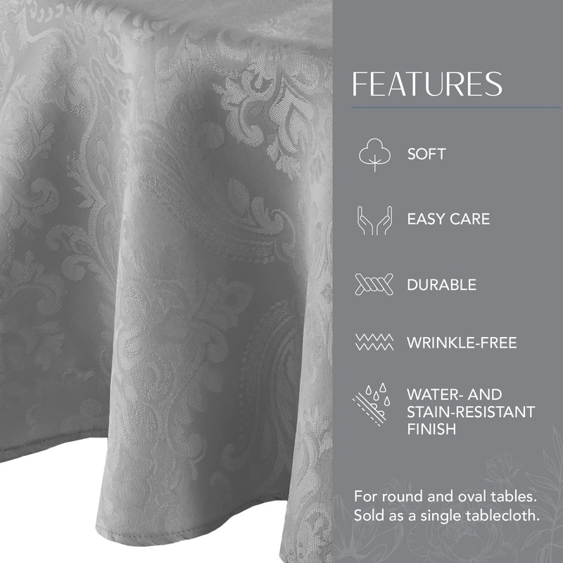 Elrene Home Fashions Caiden Elegance Damask Fabric Tablecloth, 90" Round, Silver
