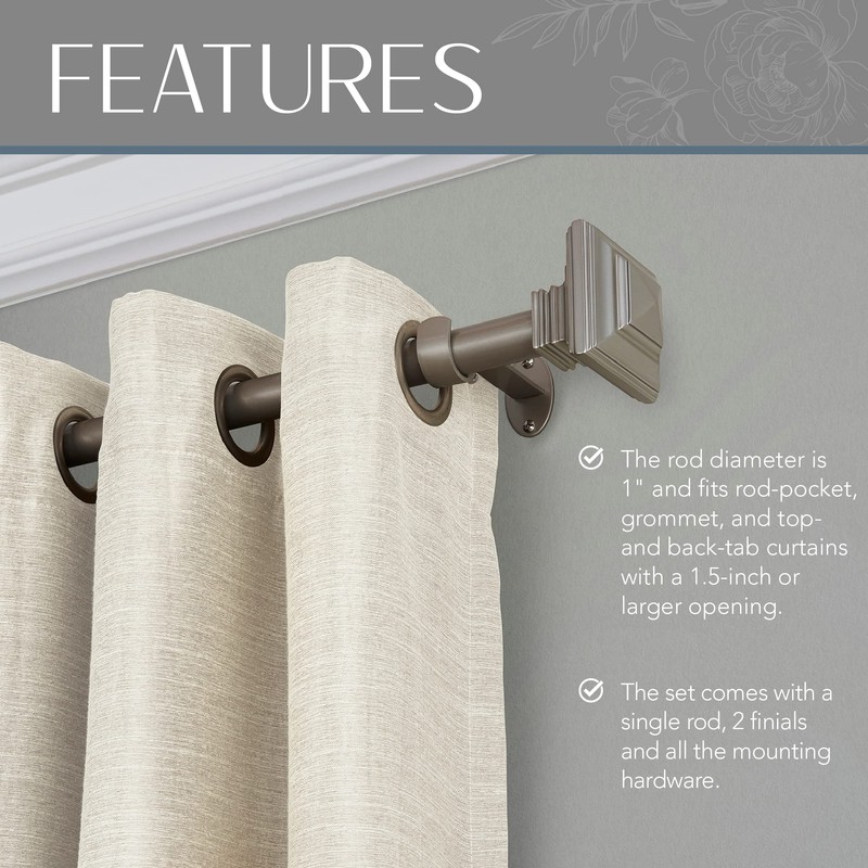 - CONTEMPORARY CURTAIN ROD: The Elrene Home Fashions Florence 1-inch single curtain rod with stacked square finials is perfect for any room in your home, such as a bedroom, a living room, or an office.