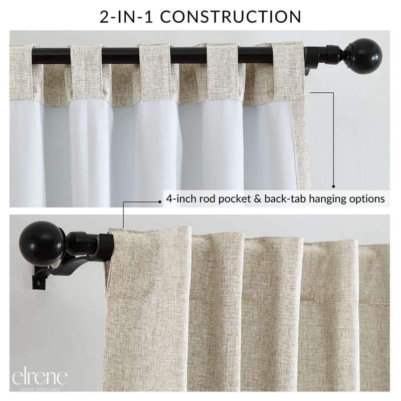 - DUAL TOP TREATMENT: Offers a 2-in-1 construction with dual hanging options: Back tabs for an elegant pleated style or rod pocket to create a more casual gathered look. The four inch rod pocket/back tabs are recommended with up to a 2 inch rod for maximum movement.