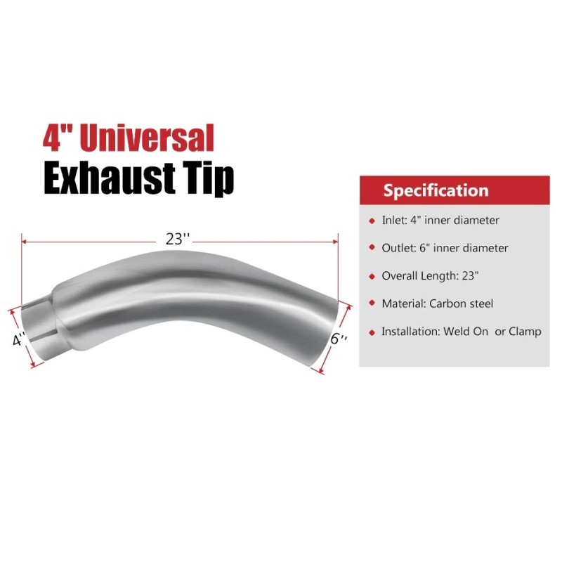 - 【DIMENSION】 4.00 Inlet 6.00 Outlet X 23.00" Long,45 Degree Diesel Exhaust Elbow Tip