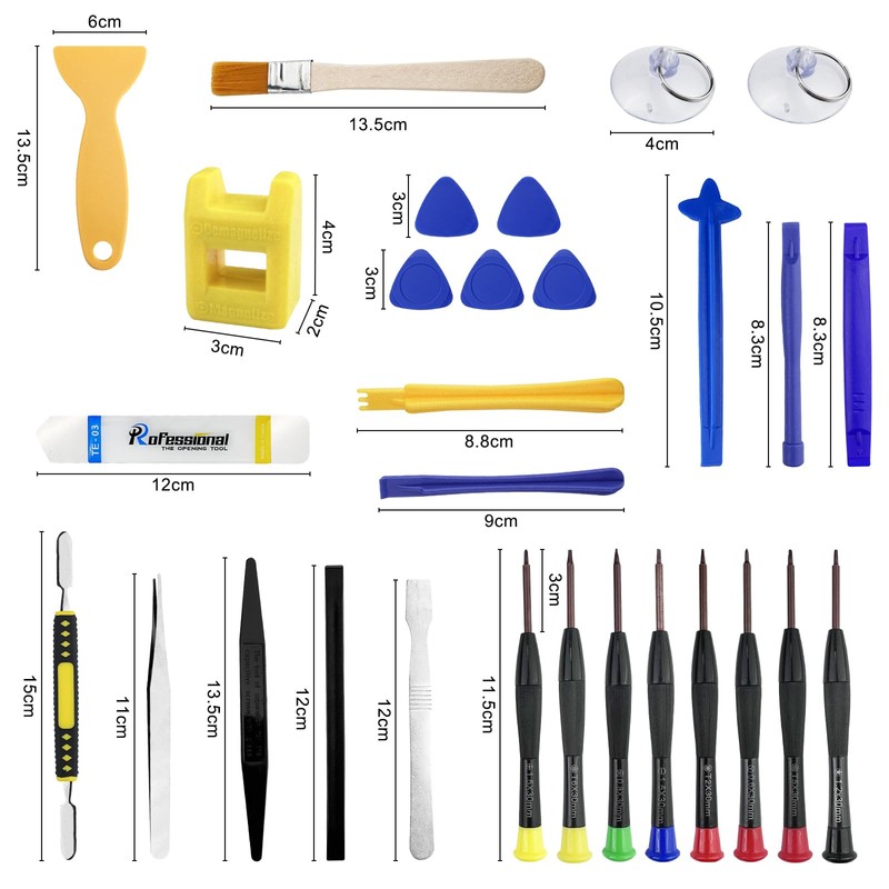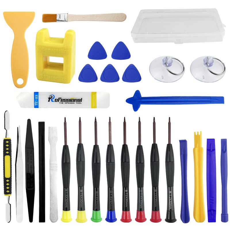 - 【Packliste】 Das Set enthält insgesamt 29 Reparaturwerkzeuge: 8 Präzisionsschraubendreher, 10 Öffnungs- und Hebelwerkzeuge, 1 Pinzette, 1 Schaber, 1 Bürste, 1 Magnetisierer, 5 Dreiecke, 2 Saugnäpfe. Verschiedene Typen und Größen, und wird mit einer kleinen transparenten Werkzeugkiste geliefert, die Ihren täglichen Reparaturbedarf deckt.