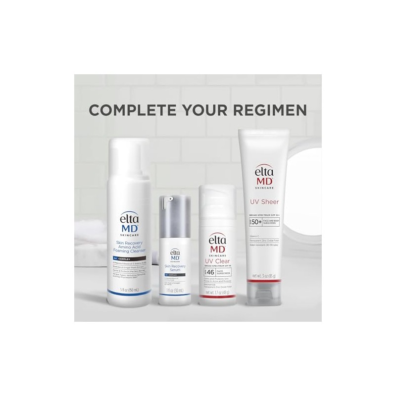 EltaMD UV Clear Face Sunscreen is an oil free sunscreen made with transparent Zinc Oxide that helps protect your skin from damaging UVA and UVB rays. This travel size SPF 46 facial sunscreen has a lightweight, silky consistency that blends in effortlessly and leaves no white cast after applying so it can be worn alone or under makeup. Dermatologists recommend EltaMD UV Clear because this face sunscreen for acne prone skin is oil-free and helps calm and protect sensitive skin types like acne, rosacea and discoloration. EltaMD UV Clear facial sunscreen is clinically proven to improve skin discoloration and color evenness by 38% in melanated skin* The sensitive skin sunscreen lotion contains Zinc Oxide, Niacinamide, Hyaluronic Acid and an antioxidant to promote the appearance of healthy-looking skin and reduce dryness and redness. This sensitive sunscreen lotion is non-greasy, fragrance-free, oil-free, paraben-free, sensitivity-free and noncomedogenic. Plus, the small 1.7 oz pump bottle makes this the perfect travel size sunscreen when you need a lightweight, facial sunscreen to bring on the go. *In a 12 week clinical study, 37 completed subjects, Fitzpatrick skin types 3-6, clinical visual evaluations conducted by a dermatologist