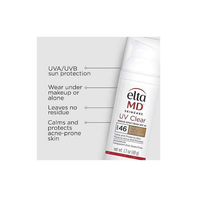 EltaMD UV Clear Tinted Face Sunscreen is a superior facial sunscreen combining effective sun protection with skin-enhancing benefits. This oil free sunscreen features transparent Zinc Oxide, crucial for blocking harmful UVA and UVB rays, making it an excellent choice for those in need of a zinc oxide sunscreen. Our SPF 46 sunscreen tinted formula blends seamlessly into the skin, leaving no white cast, and can be worn alone or as a perfect base under makeup. Particularly renowned among dermatologists, this bloqueador solar facial con color is recommended for those dealing with acne prone skin and sensitive skin issues such as rosacea and discoloration. As a protector solar con color, it is clinically proven to improve skin texture and works well even on deeper skin tones. The sensitive skin sunscreen incorporates Niacinamide, Hyaluronic Acid, and antioxidants, promoting healthy, hydrated skin while reducing dryness and redness. Perfect for daily use, this bloqueador solar facial is non-greasy, fragrance-free, and sensitivity-free. The Elta MD tinted sunscreen is conveniently packaged in a 1.7 oz pump bottle, it is the ideal protetor solar facial to carry wherever you go, providing essential sun skin care with its compact, travel-friendly design. This sunscreen for acne prone skin also serves as a reliable oil free sunscreen, ensuring your skin remains clear and protected. EltaMD continues to prioritize your skin's health with products designed to cater to various skin types and sun protection needs.