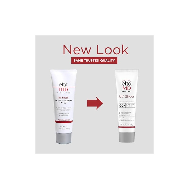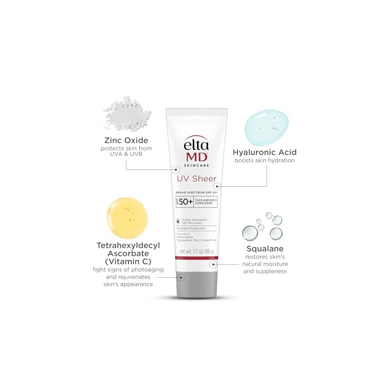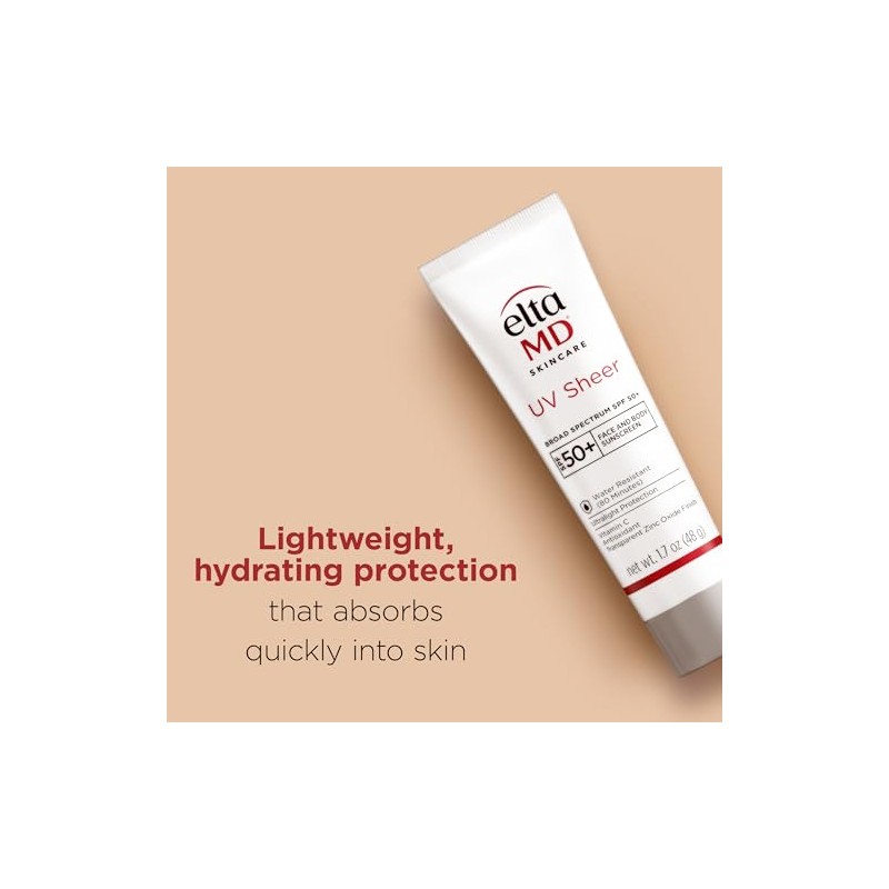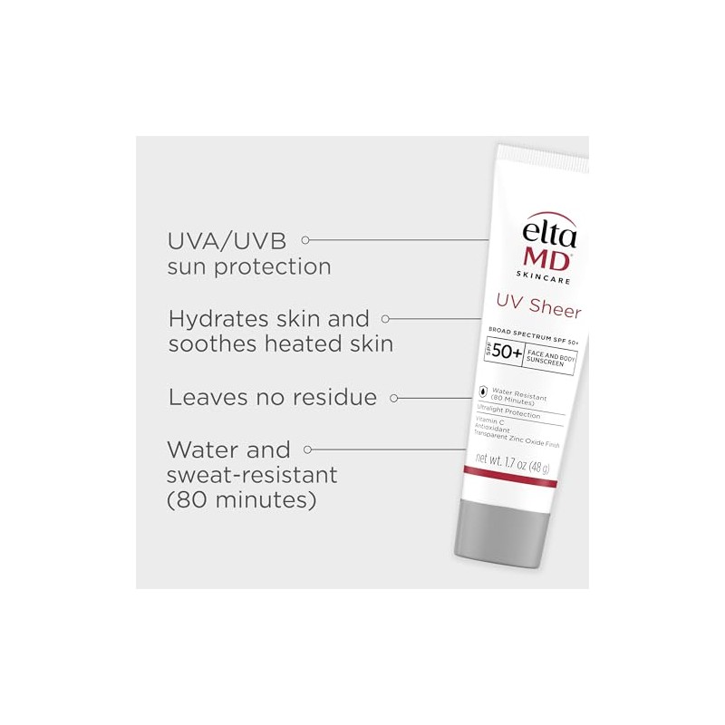 Product DescriptionDiscover the ultimate skincare solution with EltaMD UV Sheer Face Sunscreen, designed to meet the needs of all skin types. It combines protection with hydration, serving as an effective face moisturizer with SPF. This SPF face moisturizer is great for both daily use and outdoor activities, allowing your skin to stay shielded and hydrated. The facial moisturizer with SPF includes powerful ingredients like Hyaluronic Acid and Squalane, blending seamlessly into your routine, making it ideal for those seeking a sunscreen lotion that doubles as a face moisturizer for men or women. Our face lotion is water and sweat-resistant for up to 80 minutes, providing continuous protection without a white cast. EltaMD UV Sheer offers a broad-spectrum formula to defend against harmful UVA and UVB rays, maintaining your skin's health and appearance. Experience the blend of a facial moisturizer with advanced sun protection, suitable for sensitive and irritated skin. Its non-comedogenic and fragrance-free properties further enhance its role as a reliable face moisturizer. Embrace the confidence of protected skin with this versatile face moisturizer that's indispensable in your daily skincare regimen.Brand StoryEltaMD Skin Care is committed to helping you have great skin for life. Our company has developed sunscreen, skin care products and wound healing products trusted by physicians for more than 25 years.
