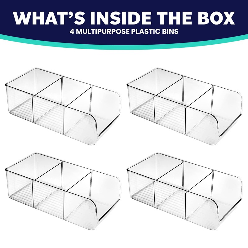 ELTOW 4 Pack Snack Organizer for Pantry, 3 Compartment Plastic Pantry Organizer Bins with Removable Dividers, Chip Organizer for Pantry, Food Packets, Spices, Condiments, Fridge, Cabinet, Kitchen
