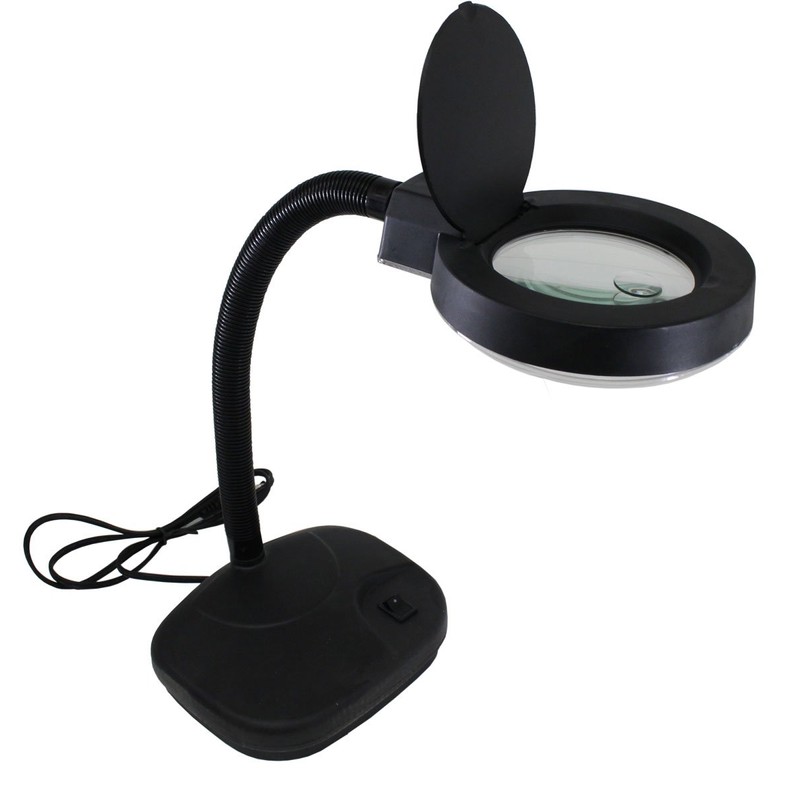 Great As A Regular Fluorescent Desk Lamp, Lift The Trap Door And You Have A Powerful 3 1/2" Diameter 5x Magnifier! The Flexible 12" Gooseneck Allows The Light To Be Directed Where Needed. Replaceable Round Fluorescent Blub Gives A Steady Stream Of Cool Light. Black Finish, Ul Approved With Directional Plug, On-off Switch. * Operates on 110V, regular household current- on/off switch on base * Has an 11 W fluorescent light bulb, and a flip top cover for the magnifier-black color * 3 1/2 Inch magnifier lens: 3 diopter/ 8 diopter- distortion free * 12 Inch flexable neck can adjust wherever you need it * Sleek design takes up very little space on your counter or table top