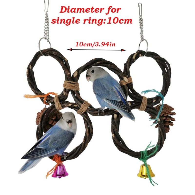 Elvaesther Birds Parrots Hand-Woven Hanging Ring Perch Stand Bird Swing Climbing Toy with Bells Pine Cones Cage Supplies 5 Rings (Double Row)