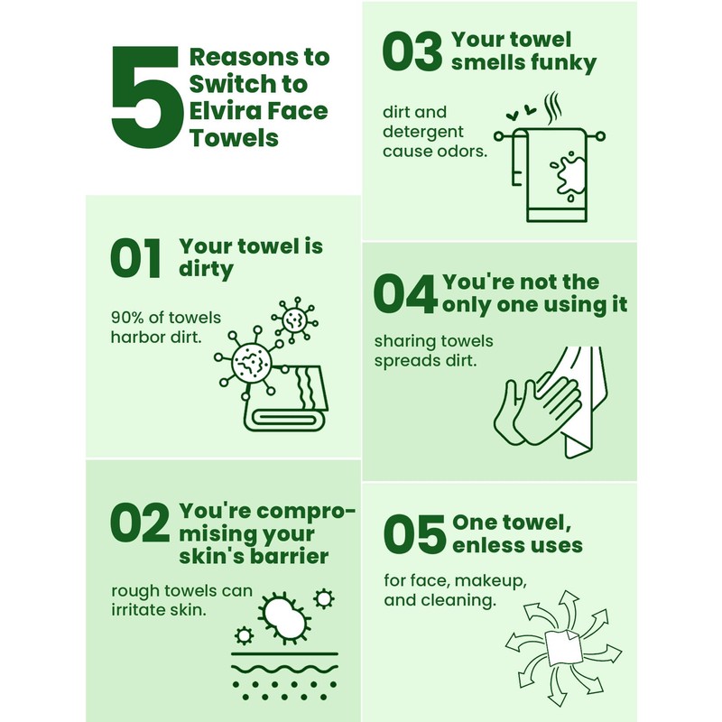 - UPGRADE FROM TRADITIONAL TOWELS TO ELVIRA: Common towels can be breeding grounds for irritants. Elvira facial towels help clear your skin, reducing irritation and redness