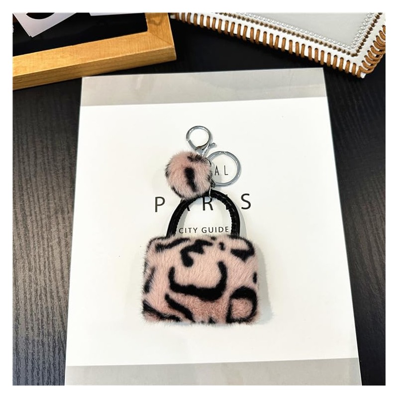 ELVRLA Elegant Classical Mini Leopard Handbag Shape Keychain Soft Plush ball Key Chain Key Ring Holder Bag Charm Purse Pendant -Pink