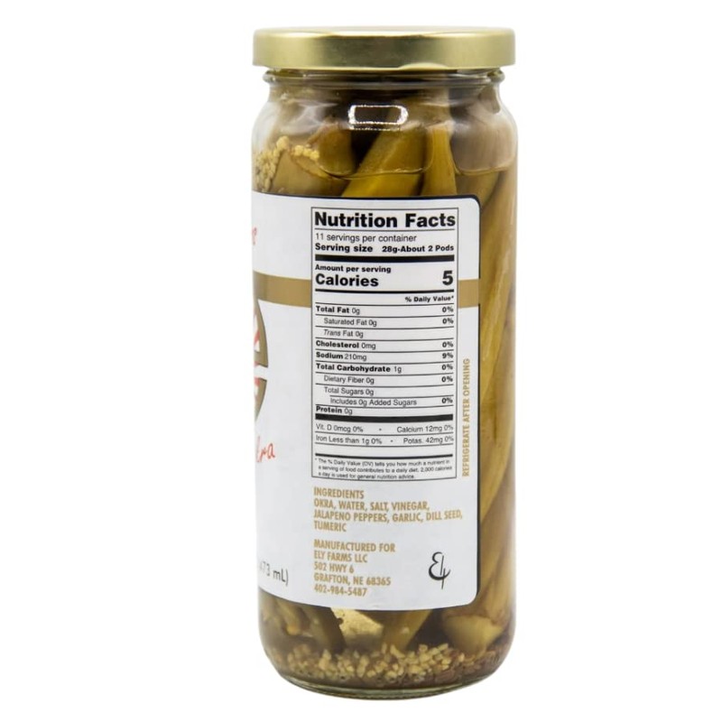 Garnish a Bloody Mary with a spear, dress up a relish tray, or just snack on it right out of the jar. Ely Farms pickled okra is an excellent appetizer, hors d’oeuvre, and condiment.