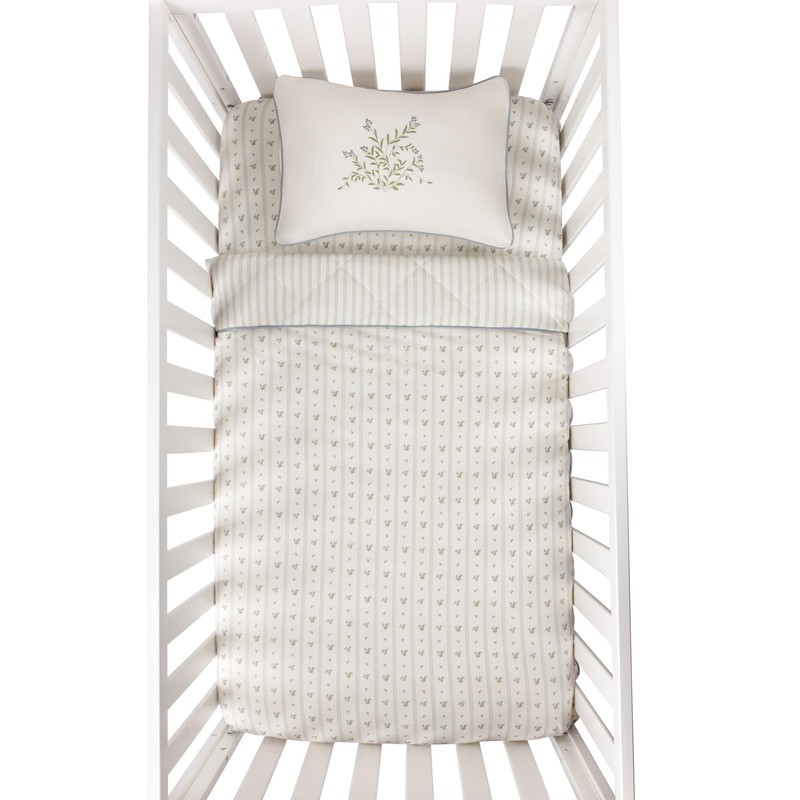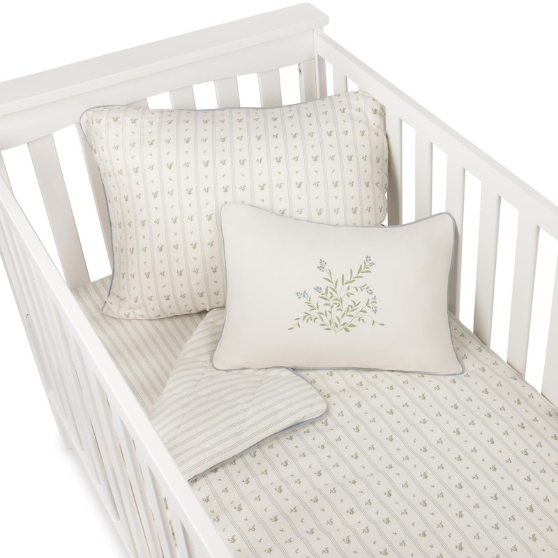 - Adorned with a charming blue berry leaf design on an ivory base with soft blue stripes, this boy mini crib bedding set adds a touch of antique elegance to your baby's nursery décor, making it a perfect choice.