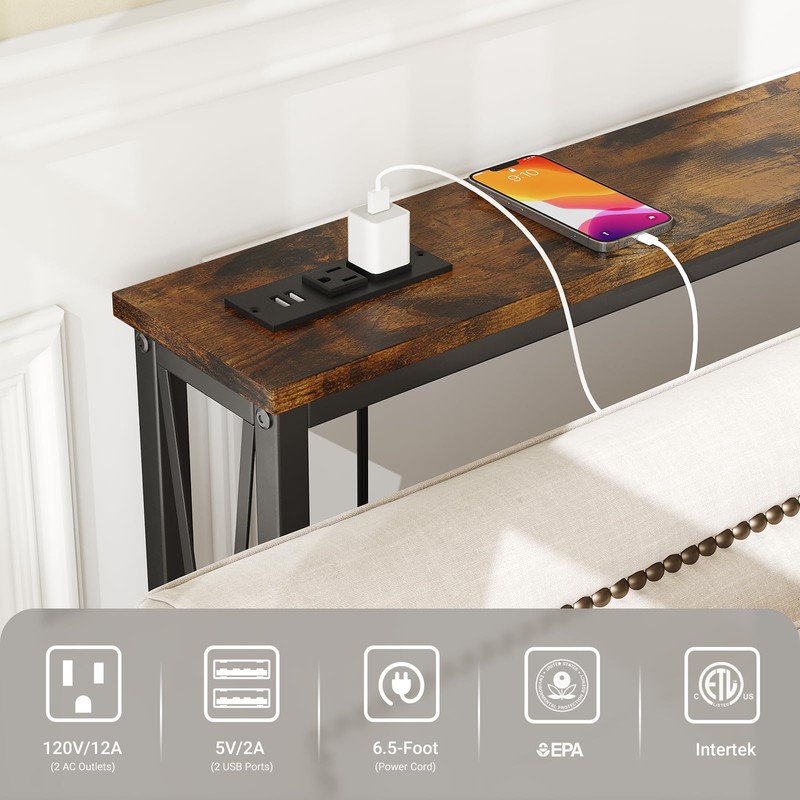 - Sofa Table with Built-in Outlets: Equipped with 2 standard 120VAC outlets and 2 USB ports on each side, along with a 6.5’ long power cord, this console table is designed to rescue you from the inconvenience of an inaccessible outlet behind your sofa, and then you can effortlessly power up your phone, tablet, headphones, and more—all within arm's reach, allowing you to fully indulge in your leisure time on the sofa