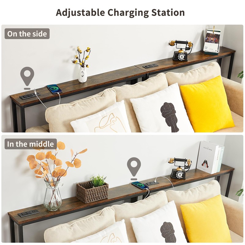 - Back Sofa Table with Outlets: The narrow long table with 2 standard 120VAC outlets, 2 USB ports and 6.5 feet long power cord to rescue the socket behind the sofa to charge the laptop/mobile phone