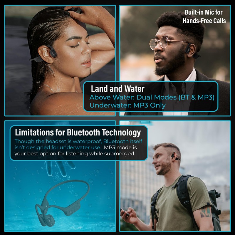 - BLUETOOTH 5.3 & BUILT-IN MIC Wireless Bone Conduction headphone supports bluetooth 5.3 for a faster and more stable connection. This allows uninterrupted sessions while listening to music, audiobooks, podcasts and calls with a range up to 33 feet. You can use the voice-assistant to make calls and play music while your phone is nearby, which is great for lounging around the pool or jacuzzi.