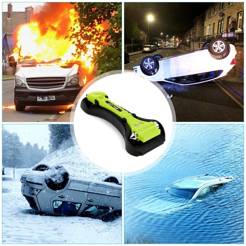 - ✔2-in-1 Emergency Escape Tool: Provide a window hammer and seat-belt cutter. Hard sharp tungsten steel double-sided points for quickly shattering windows in an emergency. The tail has a blade to cut the seat belt.