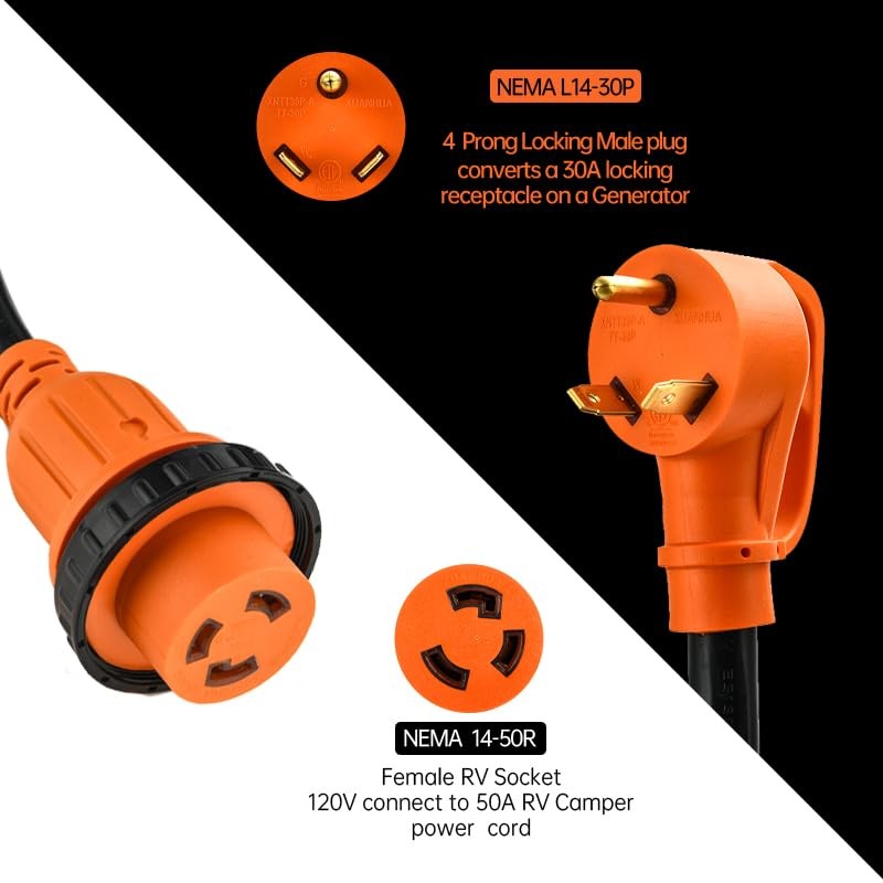 - Generator to Transfer Switch Inlet Box: Our 10FT power adapter cord comes with a NEMA TT-30P plug and a L14-30R lock female receptacle to ensure secure and reliable connections. It is ideal for generators without an L14-30R receptacle for connecting to the house from the generator's TT-30R outlet. The TT-30P to L14-30R supports a maximum overload of 30 Amps, 125V and 3750 watts