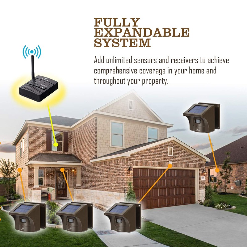 - EASY TO INSTALL- Quick Start Guide has you operational in minutes. Can expandable up to 4 sensors and unlimited receivers for complete coverage of your perimeter. Wireless driveway alarm Detects movement from humans, cars, and large animals. There are 4 fun & unique chimes to choose from. Match different chimes with different sensors around your property to differentiate where driveway alarm wireless motion is being detected.