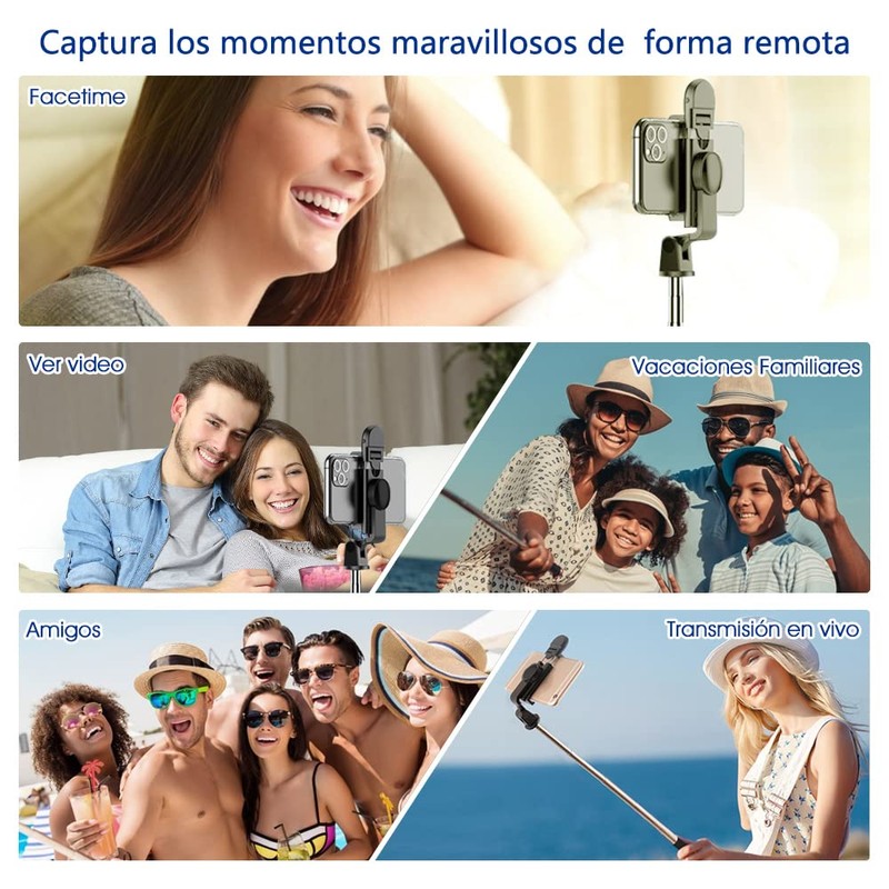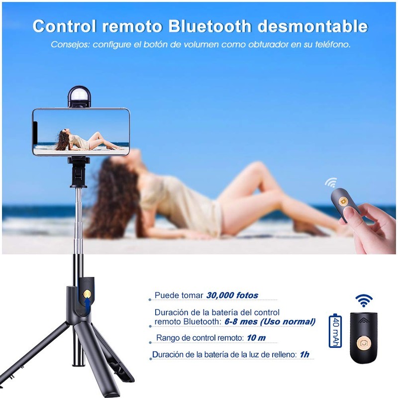 - 3 en 1 Selfie Stick con tamaño portátil - Esta selfie stick con disparador inalambrico funciona como Handie Selfie Stick, Tripod Selfie Stick, Bluetooth Selfie Stick. El palo selfie pesa solo 145 gramos y mide solo 18.5 cm en estado original, es ultraligera para llevar en su bolsillo o bolso.
