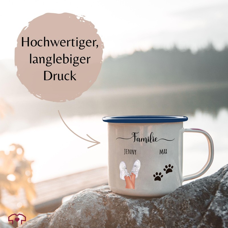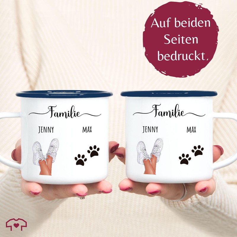 Emaille Tasse Blechtasse - Hunde - Familie mit Hund personalisiert I Hundebesitzer Geschenk mit Pfoten I Geschenk Hundeliebhaber mit Name I Hundehalter Geschenke mit Pfotenabdruck - 300 ml - Weiß