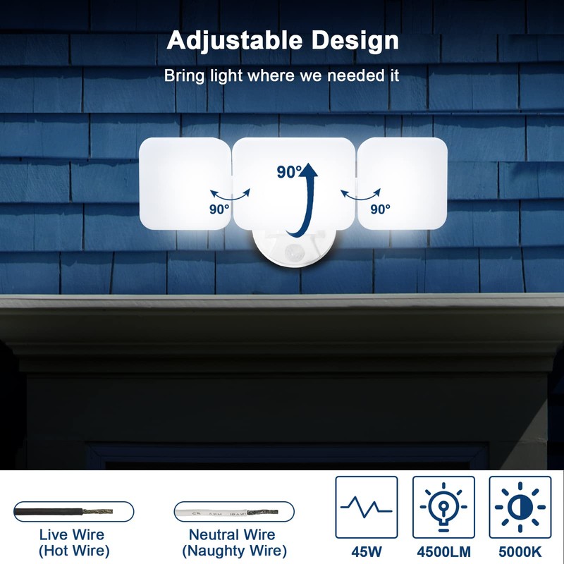- 4500LM Super Bright and Energy Saving: EMANER 45W outdoor security flood light is illuminated by high quality and efficient LEDs, producing up to 4500LM high brightness output, equivalent to 400W incandescent bulbs. Only light up at night when motion detected, motion off at dawn.