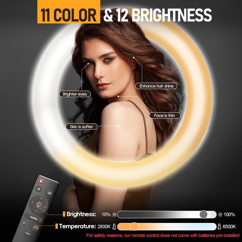 - Remote ControlChange the color temperature and brightness,adjustment is accessible from the included remote control. Especially the color temperature, it does not require change filters like some other ring lights,only press a button on the remote.Tips:The 18-inch ring light contains only the batteries in the 2 remote controls, and the other batteries are not included.