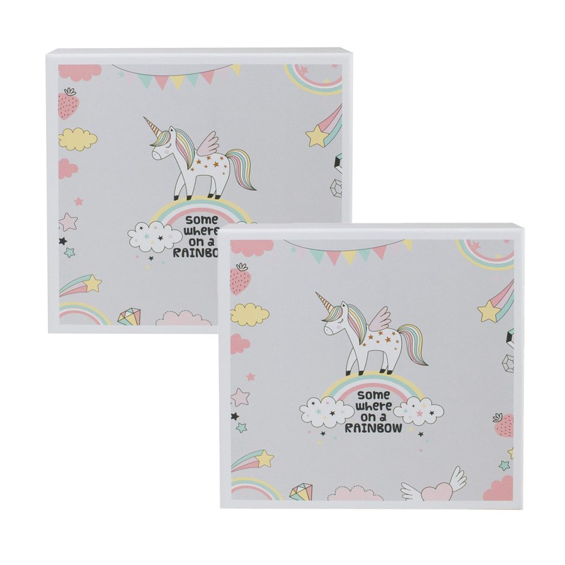 Emartbuy Set of 2 Gift Box, 19 x 19 x 6 cm, Pink Unicorn Box with White Lid and White Interior