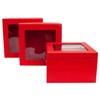 Emartbuy Set of 3 Rigid Luxury Square Presentation Gift Box, Red Print with Transparent Top, Double Layer Interior and Red and Gold Satin Ribbon Handles