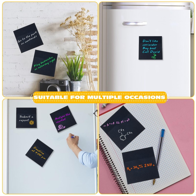 • WIDE APPLICATION: You can use the black post it note to write down your day's plans, shopping lists, memos, to-do lists, or make notes and drawings. These self-adhesive sticky notes can be used as home office and school supplies, and are suitable for any occasions.