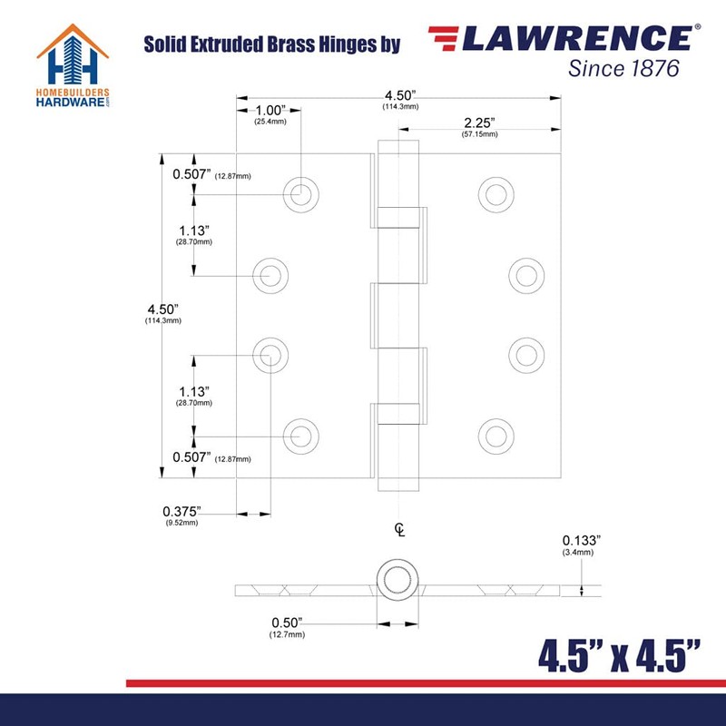 - Solid Brass - Upgrade cheap and flimsy door hardware with the hefty durability of solid brass. These 4.5 x 4.5 inch hinges are 3.4mm and engineered for long-lasting resilience and weatherproof corrosion resistance. Your best choice for exteriors.