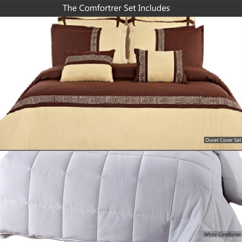 - THE EMBROIDERED DUVET COVER SET: 100% Microfiber King/Cal King (Gold and Chocolate) 7-Piece Set: ONE Duvet Cover 106" Wide by 92" Long with Button Closure, TWO Pillow Shams 20" Wide by 36" Long, TWO Euro Shams 26" Wide by 26" Long and TWO Decorative Pillows 12" Wide by 18" Long