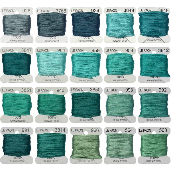 - Color: 20 Colors,all Colorfastt.All Bobbins Marked Color Number, Color Number are as follow:926,3768,924,3849,3848,3847,964,959,958,3812,3851,943,3850,993,992,3814,991,966,564,563