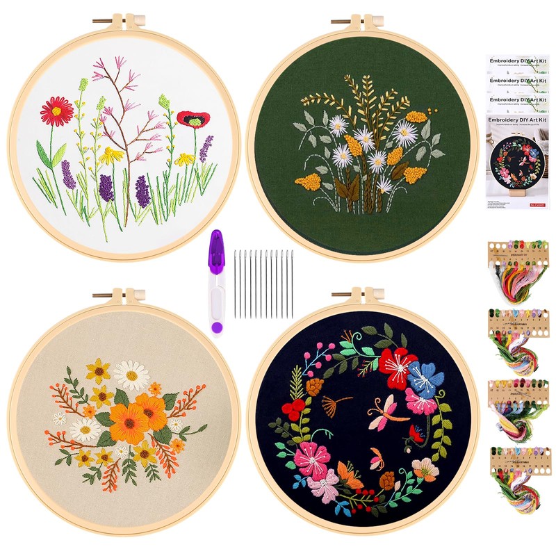 - Embroidery set for beginners: 4 sets handmade embroidery starter kit, cross stitch kit embroidery starter kit, our DIY embroidery kit for adults contains everything necessary. The instructions are easy to follow and shows well enough how the different stitches are performed, including: leaf stitch, straight stitch, back stitch and French knots. The embroidery hoops have an adjustment screw to hold the embroidery cloth firmly.