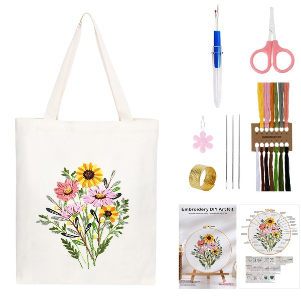 Embroidery Set Adult Beginners with Floral Pattern Canvas Bag Embroidery Set, Cross Stitch Embroidery Tote Bag, Bags Embroidery Set for Beginners Adults, Embroidery Set Including Instructions,