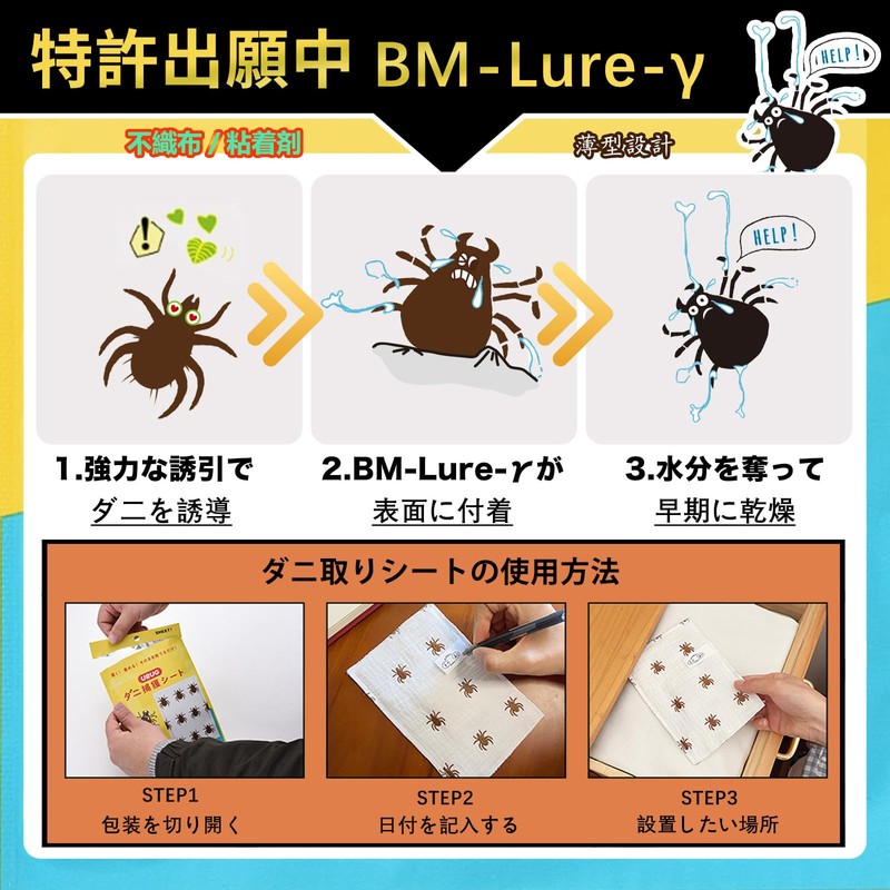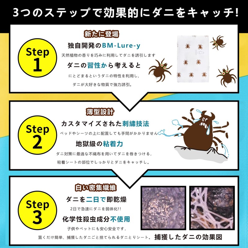 - Introducing a dust mite-removal sheet: The uniquely developed BM-Lure-y uses the scent of natural plants to attract mites. Unique embroidery technique, dust mites dry quickly in two days. Previously, dust mites caught in place even if they were trapped to dust mites and continue to keep active, producing waste and eggs, and they have gone out. However, the dry mite trap lab quickly weakens in 2 days by drying dust mites that are more than 80% in water. No chemical insecticide ingredients, so it is safe for children and pets
