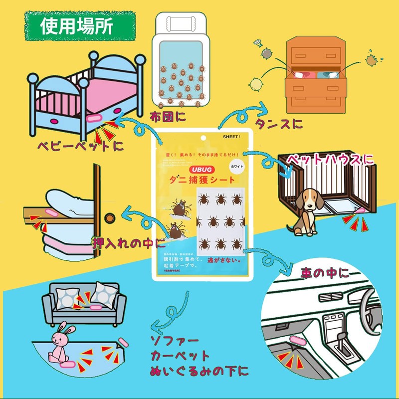 - Where to Use: It blends perfectly with any household space, and can be placed on futons, beds, sofas, carpets, closets, strollers, child seats, car seats and other places where you do not want to attract dust mites. 1 sheet uses approximately 1 to 1.5 tatami mats. Depending on the number of people in the family, the amount you use will also vary depending on Even if you live alone, you need 10 sheets to keep you comfortable for 3 months. In the two worlds, 20 sheets will support 3 months of security. In a large home with 4 to 5 families, 40 pieces of this product will help you build protection from dust mites