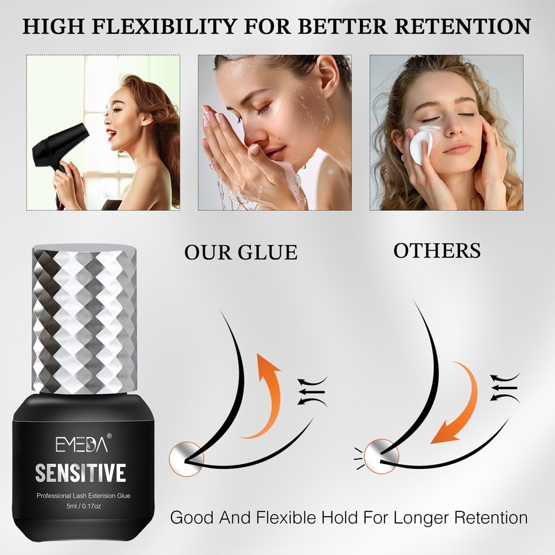 - New Flexible Soft Glue. This eyelash extension glue is gentler for sensitive skin to alleviate clients' discomfort. Easy to shape after drying, with less residue for better removal, which is easier for lash artists to handle.