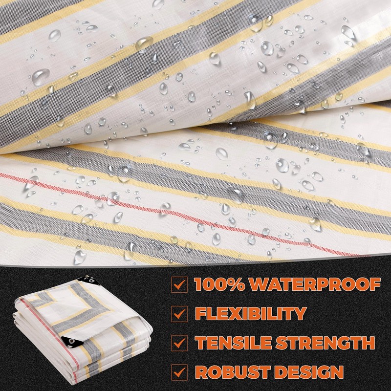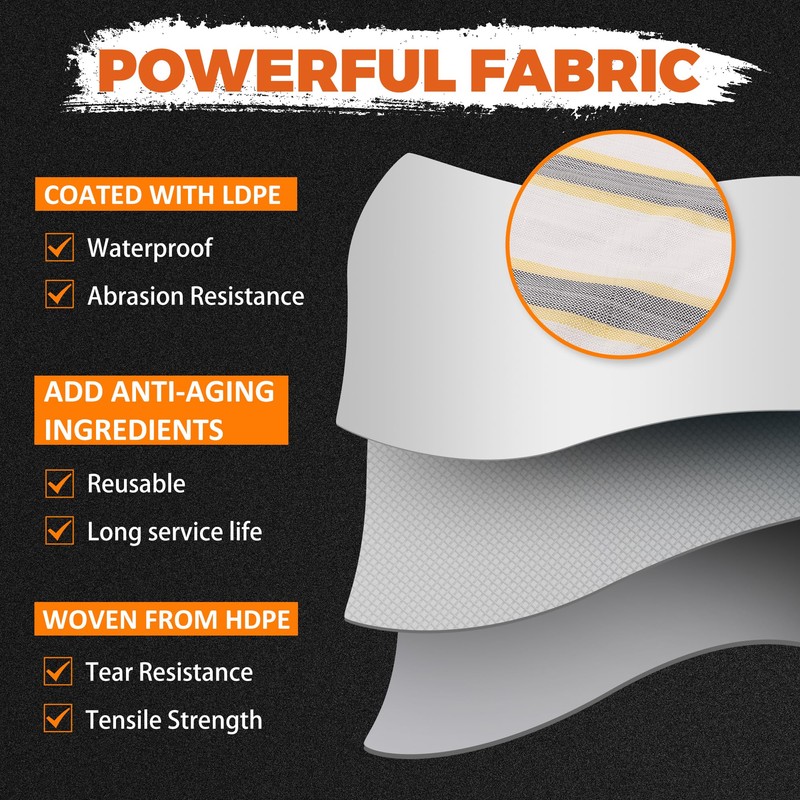 - 【HIGH QUALITY MATERIAL】This rainproof tarp is made of high quality HDPE material with anti aging ingredients, which extends the service life of the tarpaulin. Thickened edge reinforcement design with nylon rope inside, tensile, wrinkle resistant, tear resistant, odorless, washable and reusable