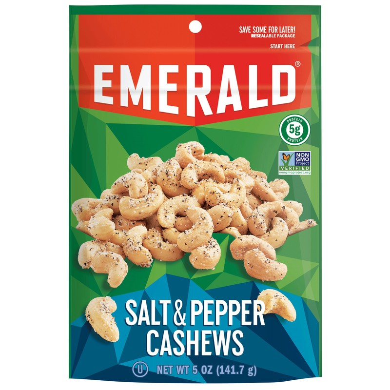 Emerald Nuts, Salt and Pepper Cashews, Stand Up Resealable Bag, 5 Ounce
