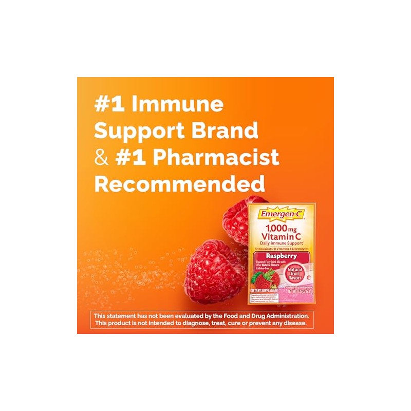 Emergen-C Emergen-C 1000mg Vitamin C Powder, with Antioxidants, B Vitamins and Electrolytes, Vitamin C Supplements for Immune Support, Caffeine Free Drink Mix, Raspberry Flavor - 60 Count/2 Month Supply