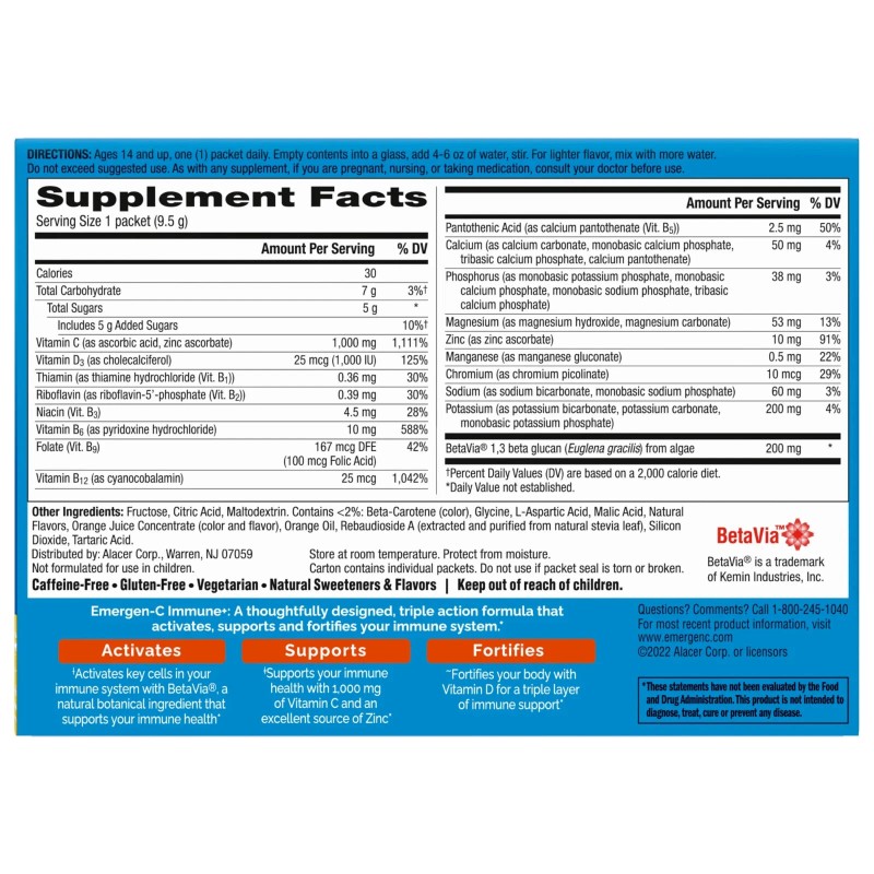 - 30ct of Emergen-C Immune+ Triple Action Immune Support Powder, with 200mg of BetaVia (R), 1000mg Vitamin C per serving, B Vitamins, and Vitamin D (2)