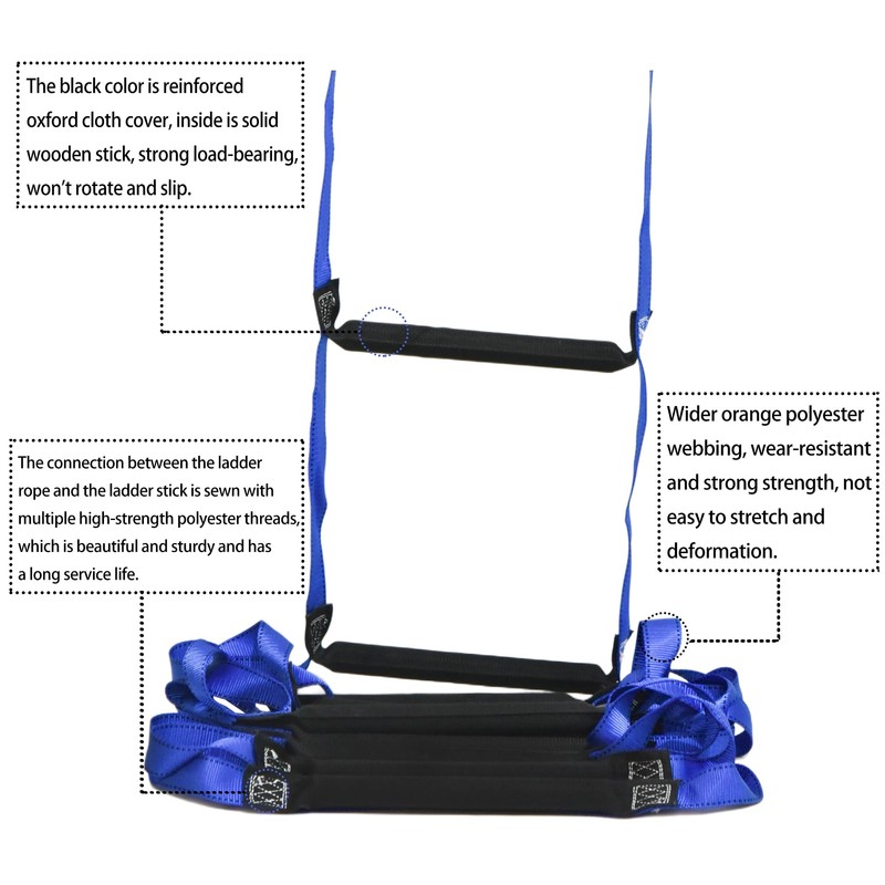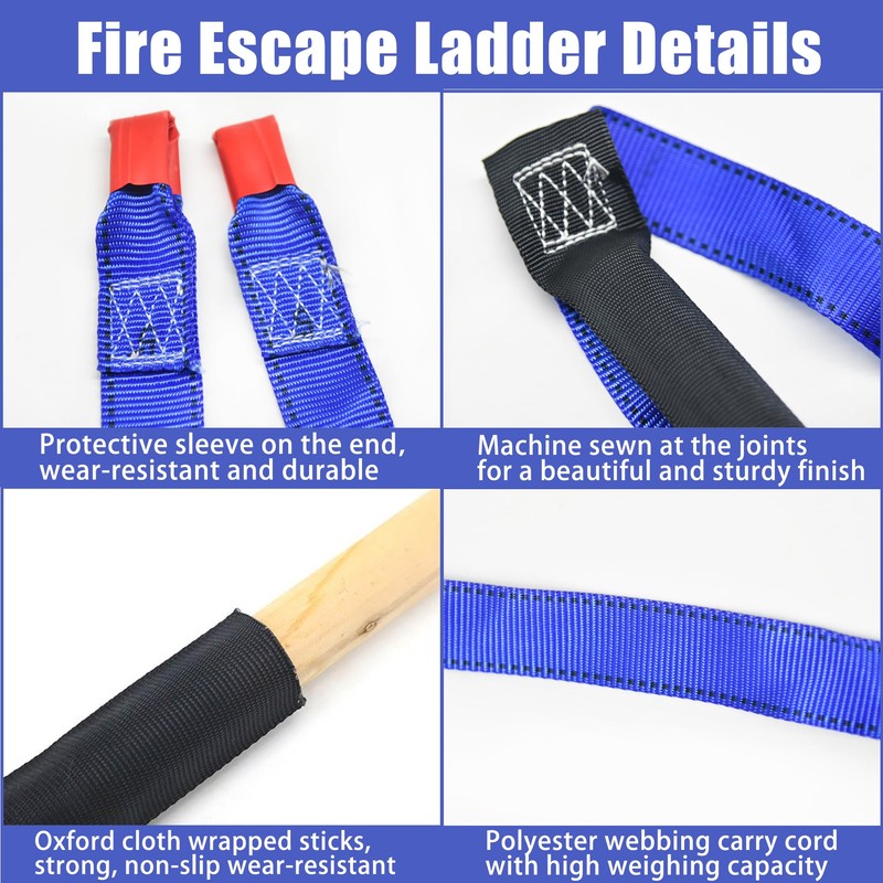 - Quality Material: Our Emergency Escape Rope Ladders are made of high quality polyester material that is strong and durable, the rungs of the ladder are solid so there is no bending or binding when stepping on them, they will not slip or spin when used when the steps are wet, they are reusable, and they have a load capacity of up to 2,000 pounds.