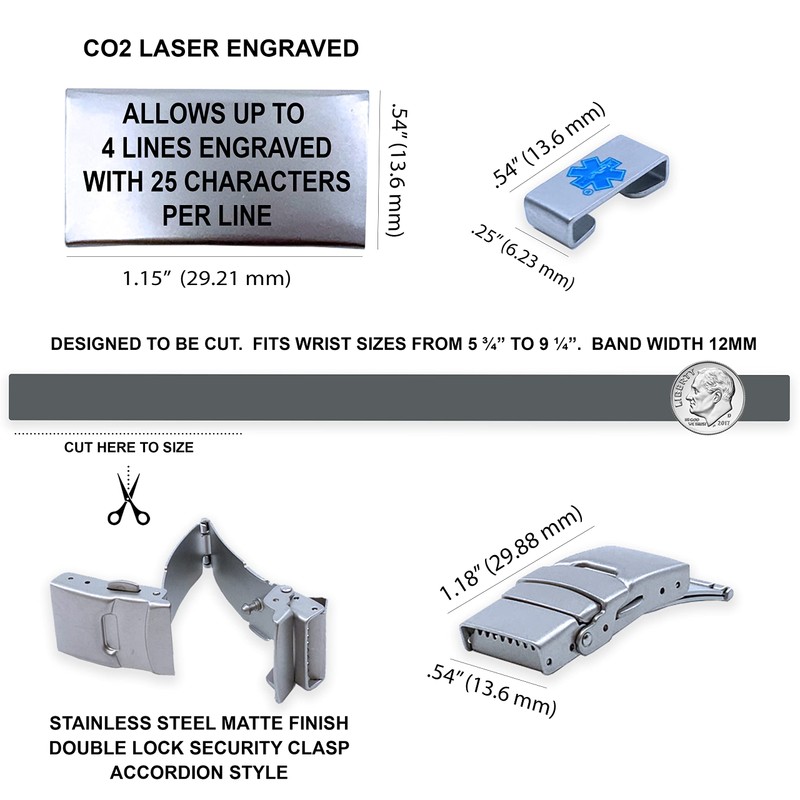 - ENGRAVING: The stainless-steel matte finish engraving plate measures 1.5 x .52 inches (37mm x 13.25mm) and allows for 4 lines of custom engraving with each line capable of 25 characters. Your engraved message will be attention-grabbing in any medical emergency with the use of our bold, high contrast black lettering lasered burned into the stainless-steel plate.