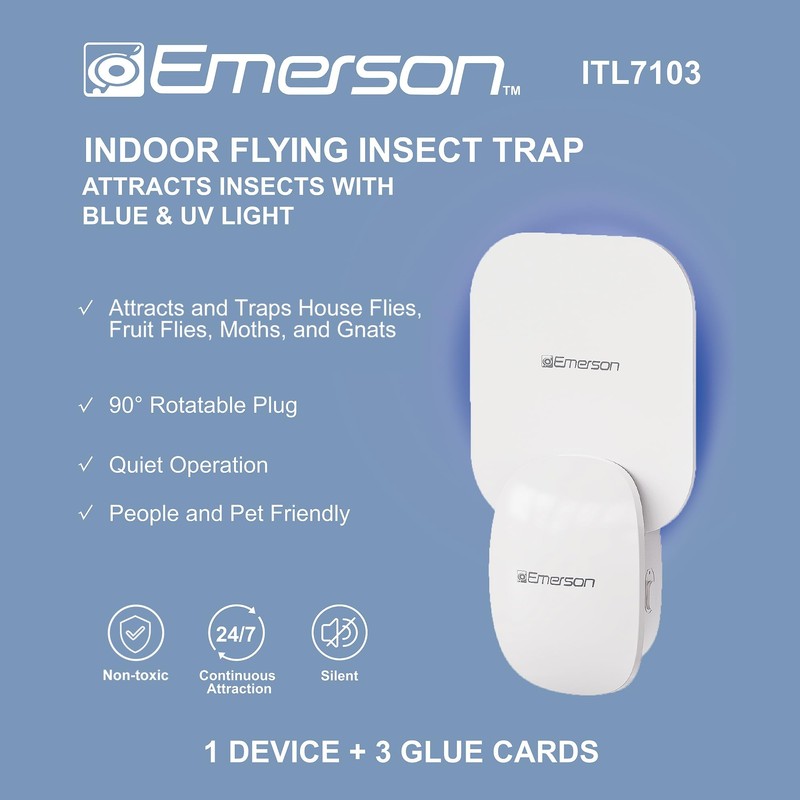Emerson ITL7103 Plug-in Flying Bug Catcher with UV Light and LED Décor – Indoor Fly, Fruit Fly, Gnat & Moth Catcher, Silent, 24/7 Coverage, Mess-Free, use in Any Room, Includes 3 Glue Cards