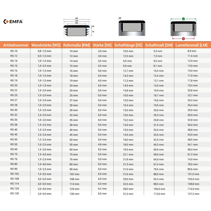 • How do I order the right lamellar plug? Choose the size of the lamellar plug that corresponds to the outer diameter of your pipe. Outer diameter and the wall thickness of the pipe must match.