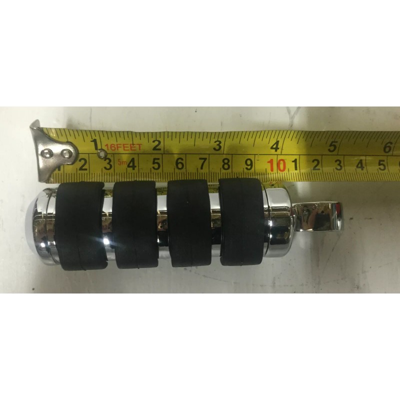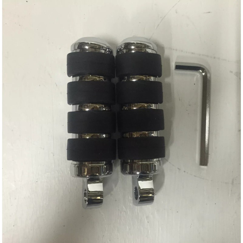 Make riding more comfortable by helping to dampen annoying vibration with our Chrome Buffalo Pegs. These metal pegs have a hollow core with 4-long-lasting black rubber pads fit into the core to help absorb road shock. The pegs are secured by a chromed recessed hex-head socket bolt that extends the length of the peg (hex wrench included for installation). Pegs attach to original foot peg mounts using existing hardware. Pegs rotate easily to suit individual riding preference and are equipped with a MALE mounting end.